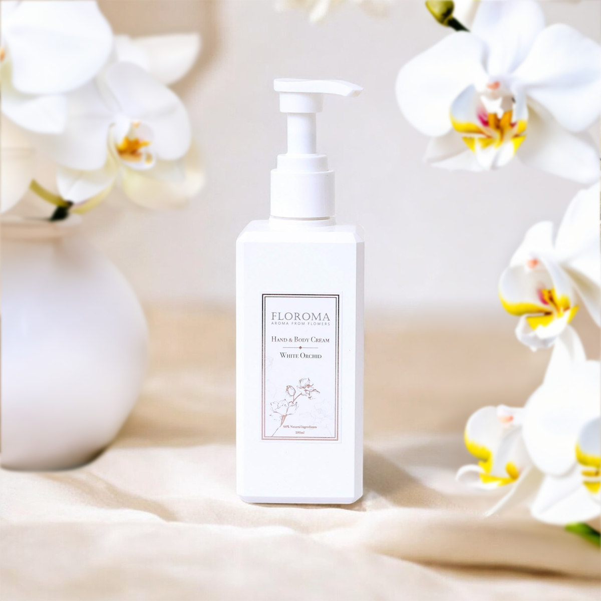 Floroma's Hand & Body Cream includes aromatic essential oils comparable to perfumes. It has the texture and scent reminiscent of perfume, with a longer-lasting fragrance compared to regular scented body lotions.
